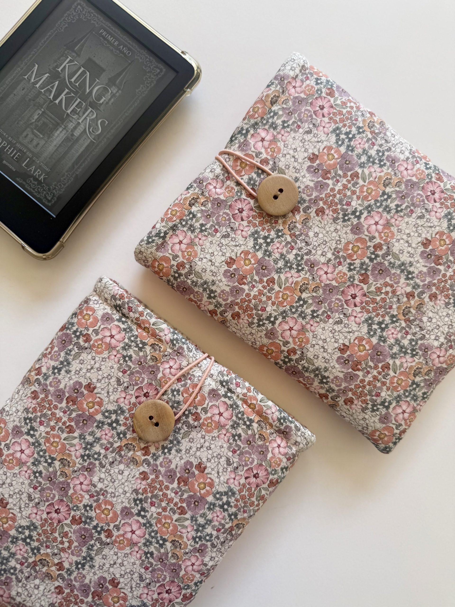 Funda de tela para ebook con estampado de flores en tonos empolvados. El forro es en tono salmón. 100% algodón y hecha a mano.