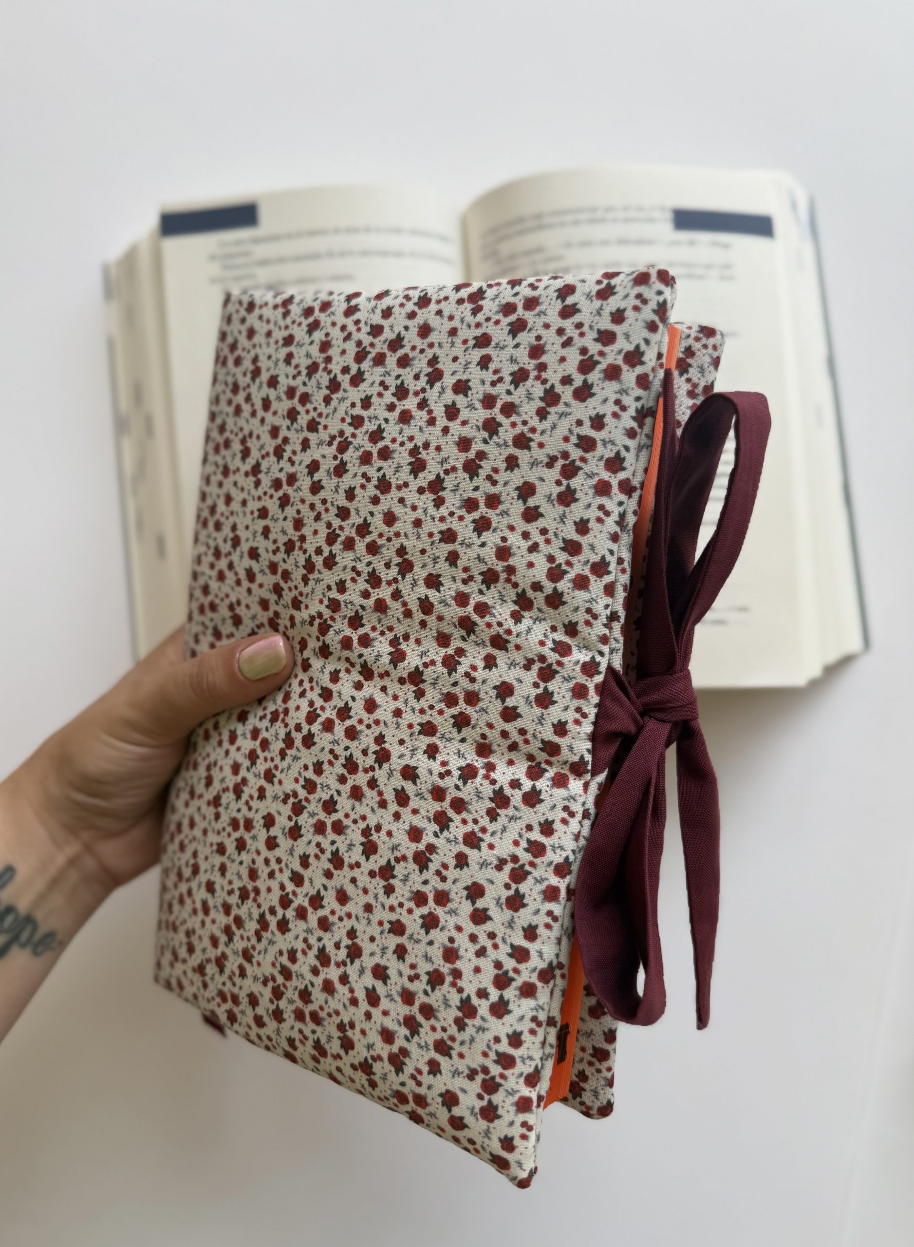 Funda de solapas para libro con estampado de rosas en tonos rojos. El forro es en tono burdeos. 100% algodón y hecha a mano.