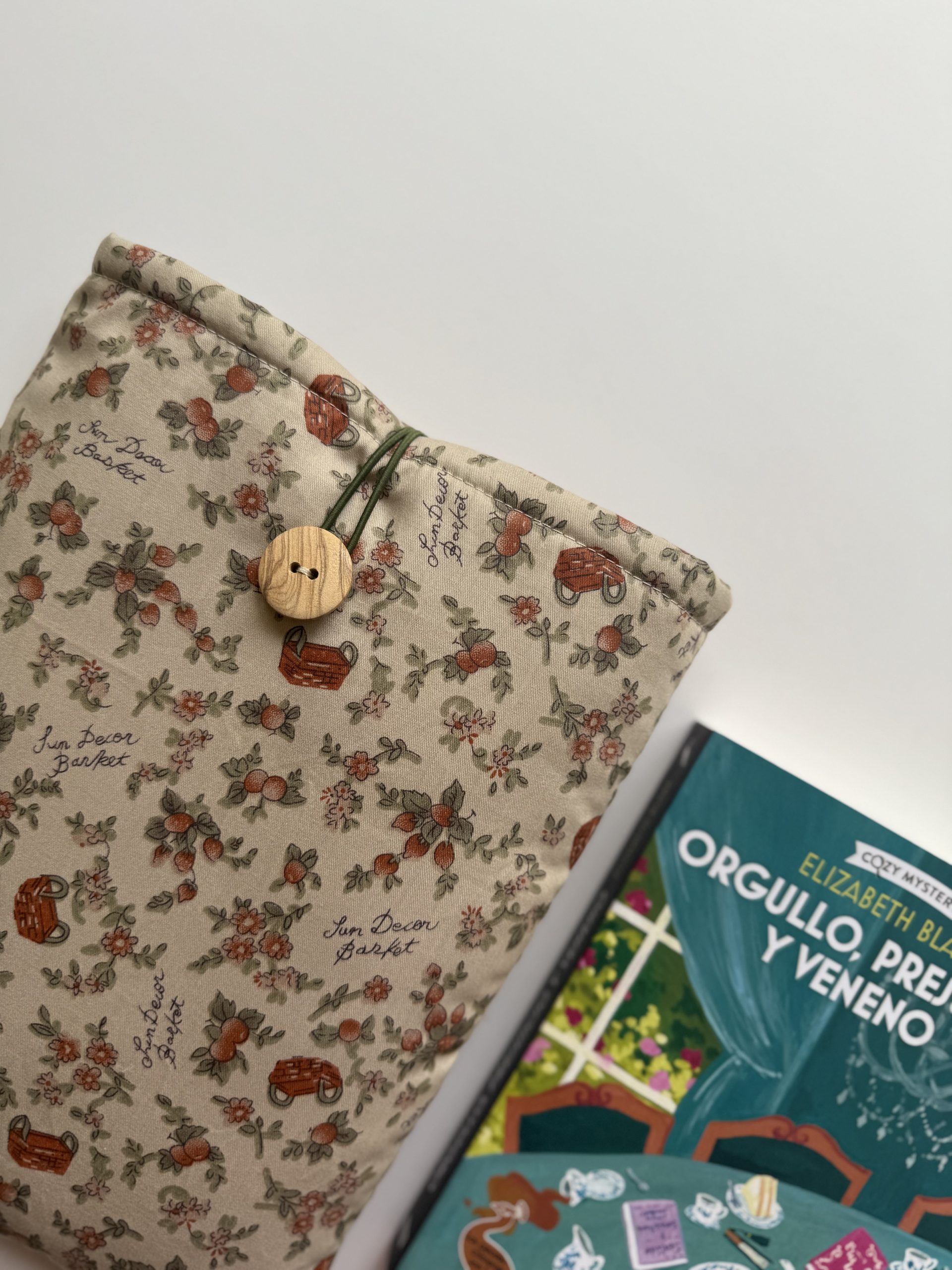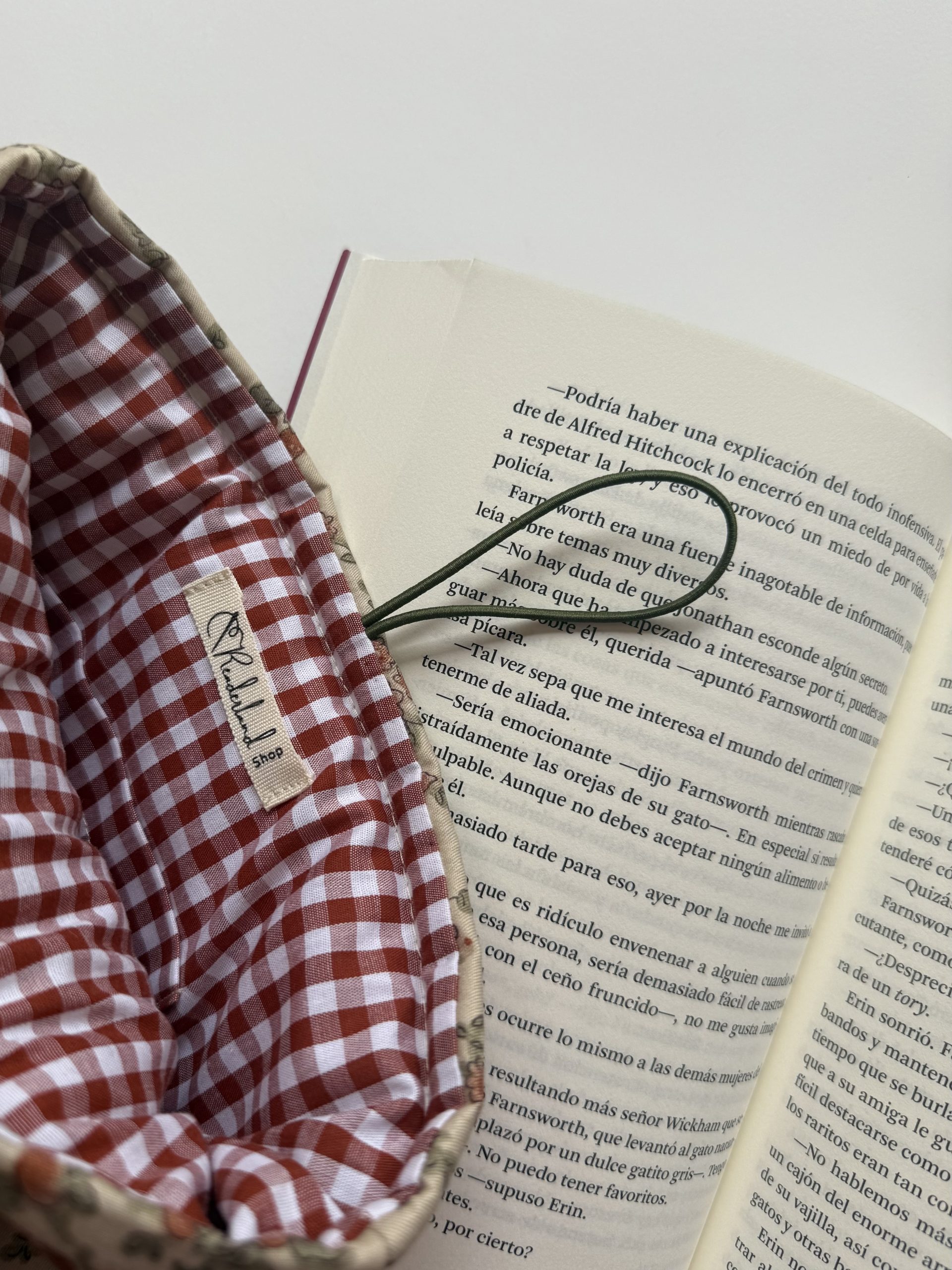 Funda de tela para libro con estampado estilo picnic. El forro es un vichy en tono teja. Como siempre, la funda lleva incorporado un bolsillo interior. 100% algodón y hecha a mano.